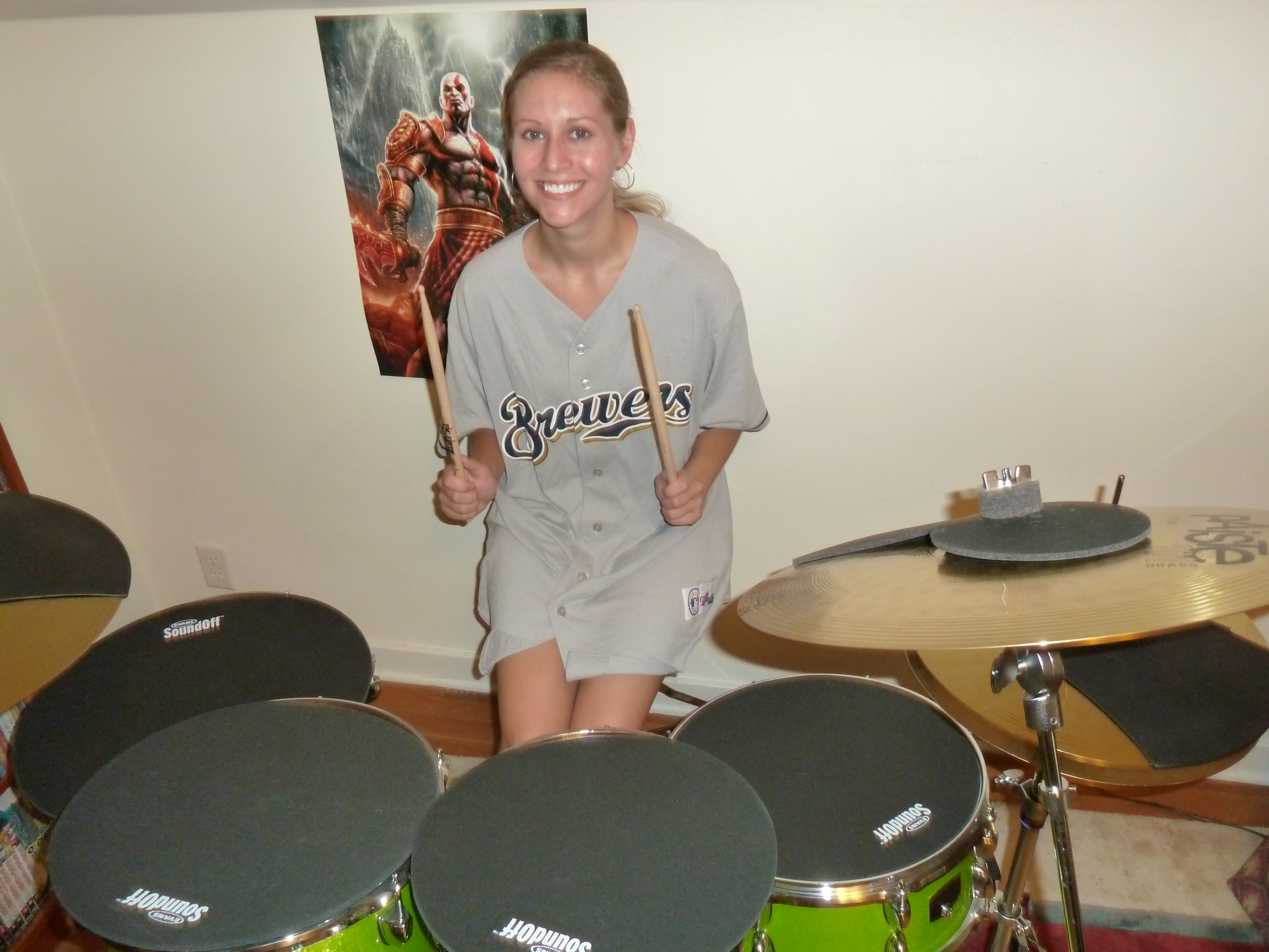 As you can see, I’m super excited about my new drum set! I’m sporting my XL Brewers jersey here. It looks like a dress, but I am wearing shorts. 😛