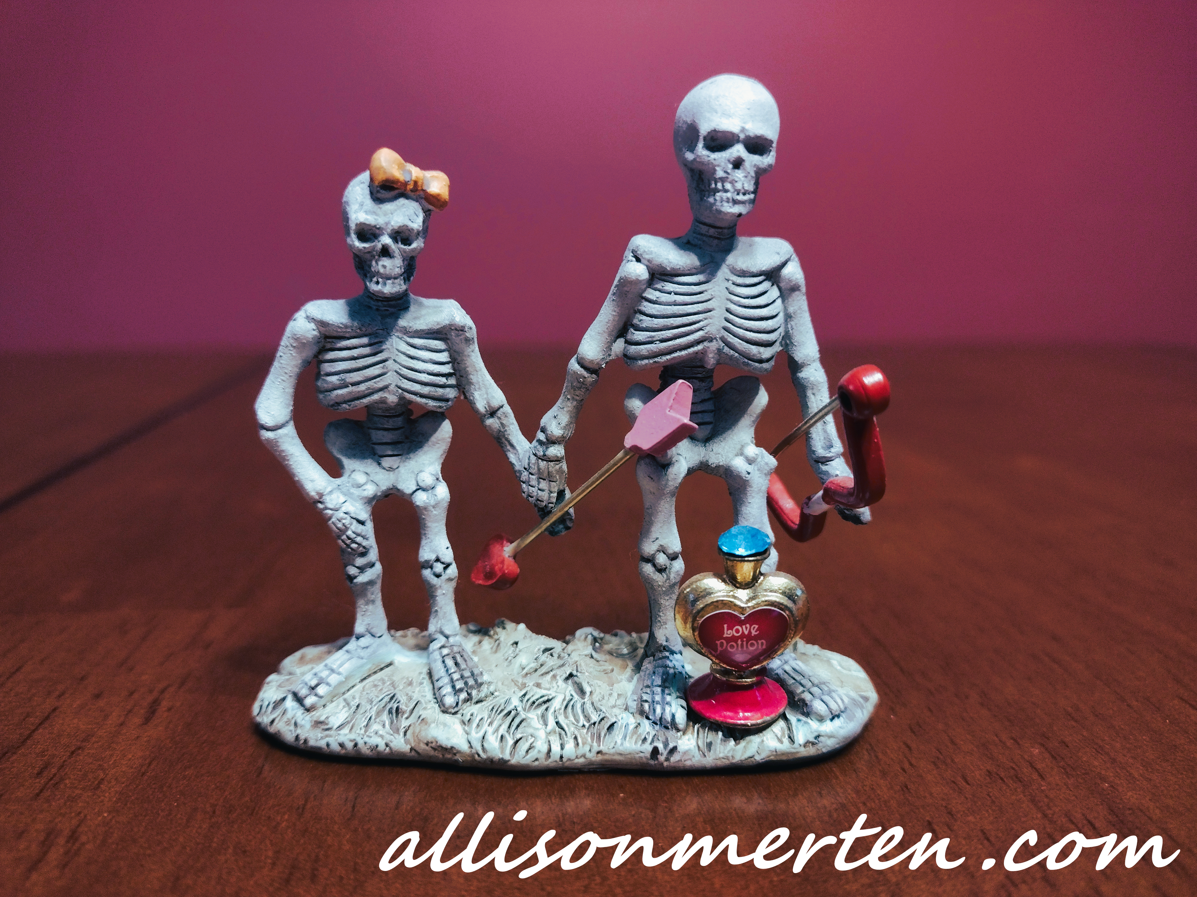 Although I LOVE painting, I did not paint this skeleton couple. What I did was I found this skeleton couple statue at a craft store during Halloween time. Then, during the Valentine’s Day season, I found the cupid bow, arrow, and love potion. I then glued the Valentine’s Day stuff to the skeleton couple who are clearly deeply in love! 🤣