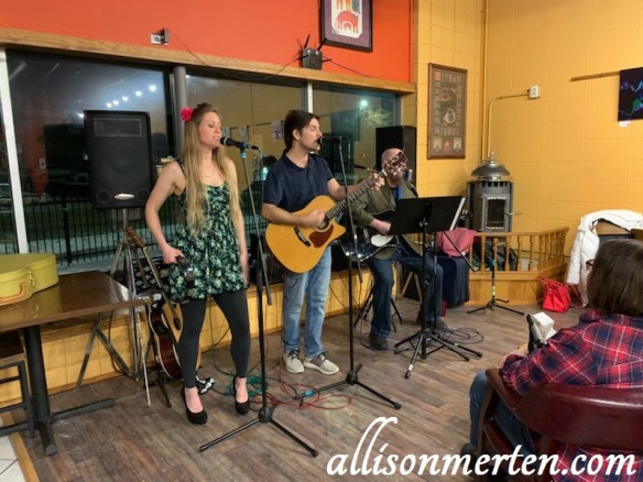 For our collaborative songs, I did backup vocals and tambourine. It was a lot of fun! π You can see in this picture that we all squeezed together by the front windows. Although it was a small space to perform in, the venue was awesome! Very cozy! π